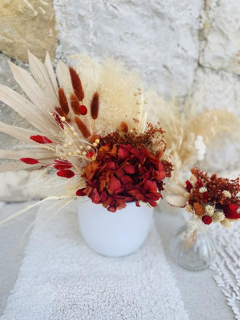Envie d’une décoration au style Bohème pour votre mariage? Je vous propose une décoration en fleurs séchées et des accessoires bohème. Bouquet de mariée, Centres de table, Décoration cérémonie, Couronnes…