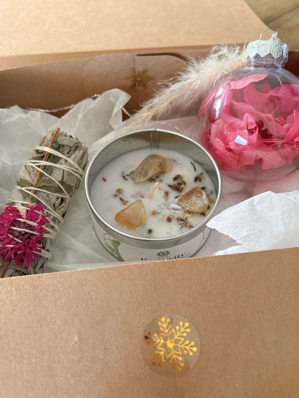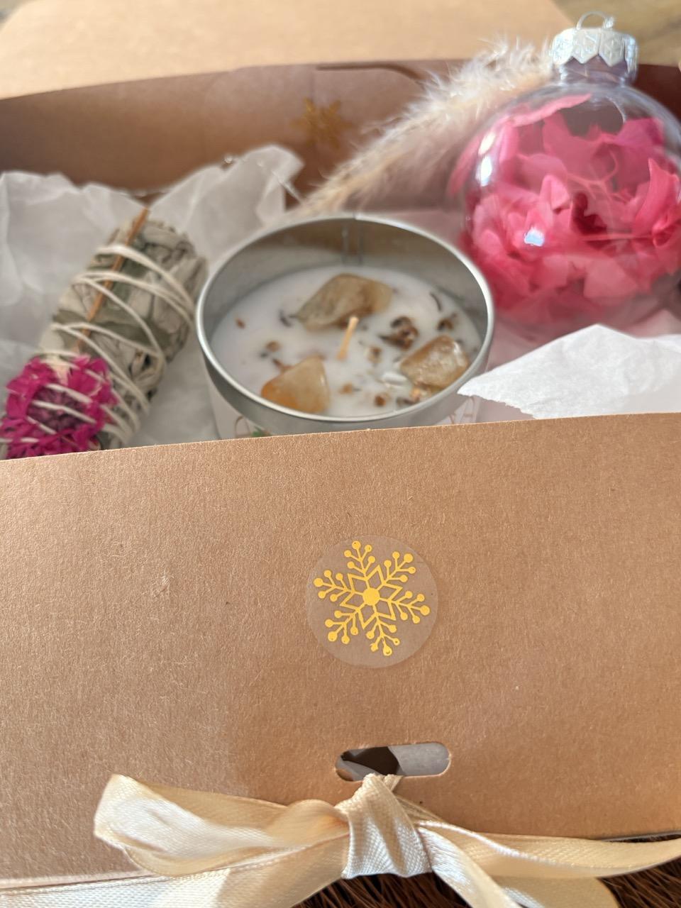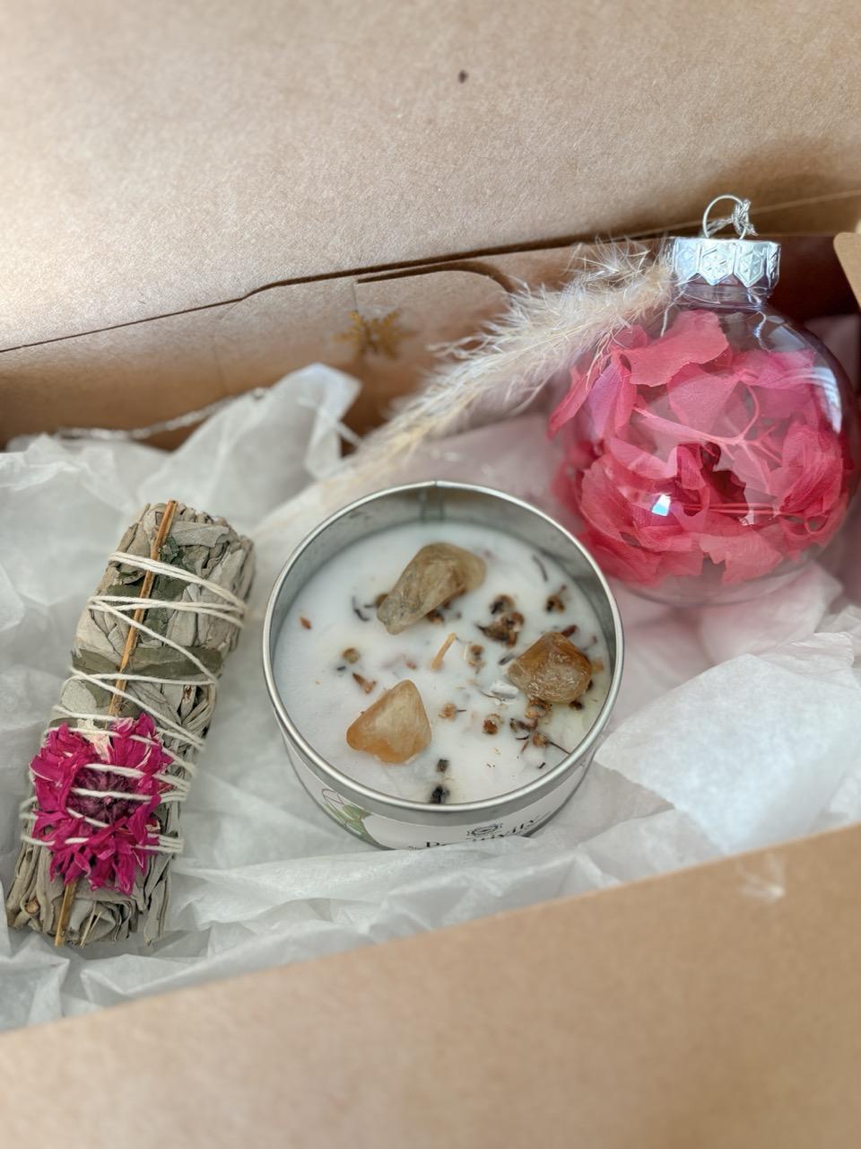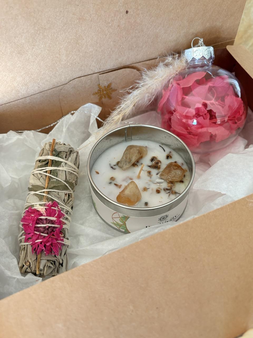 Coffret de Noël bien-être ‘Rose’ : bougie aux pierres, bâton de sauge et boule en fleurs séchées