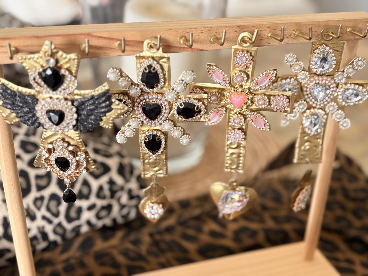 Sublimez votre intérieur avec les Ex-votos décoratifs, de véritables bijoux de mur qui allient tradition sacrée et éclat moderne. Chaque pièce est une œuvre unique, entièrement customisée à la main avec une sélection minutieuse de strass colorés.