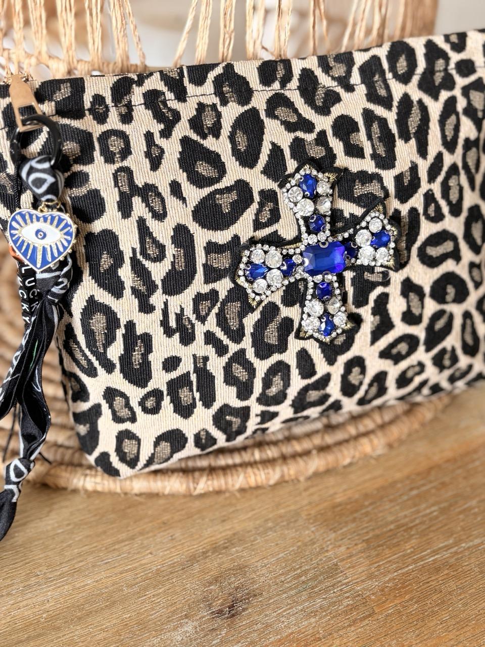 Pochette Bohème Léopard – Croix strass bleu