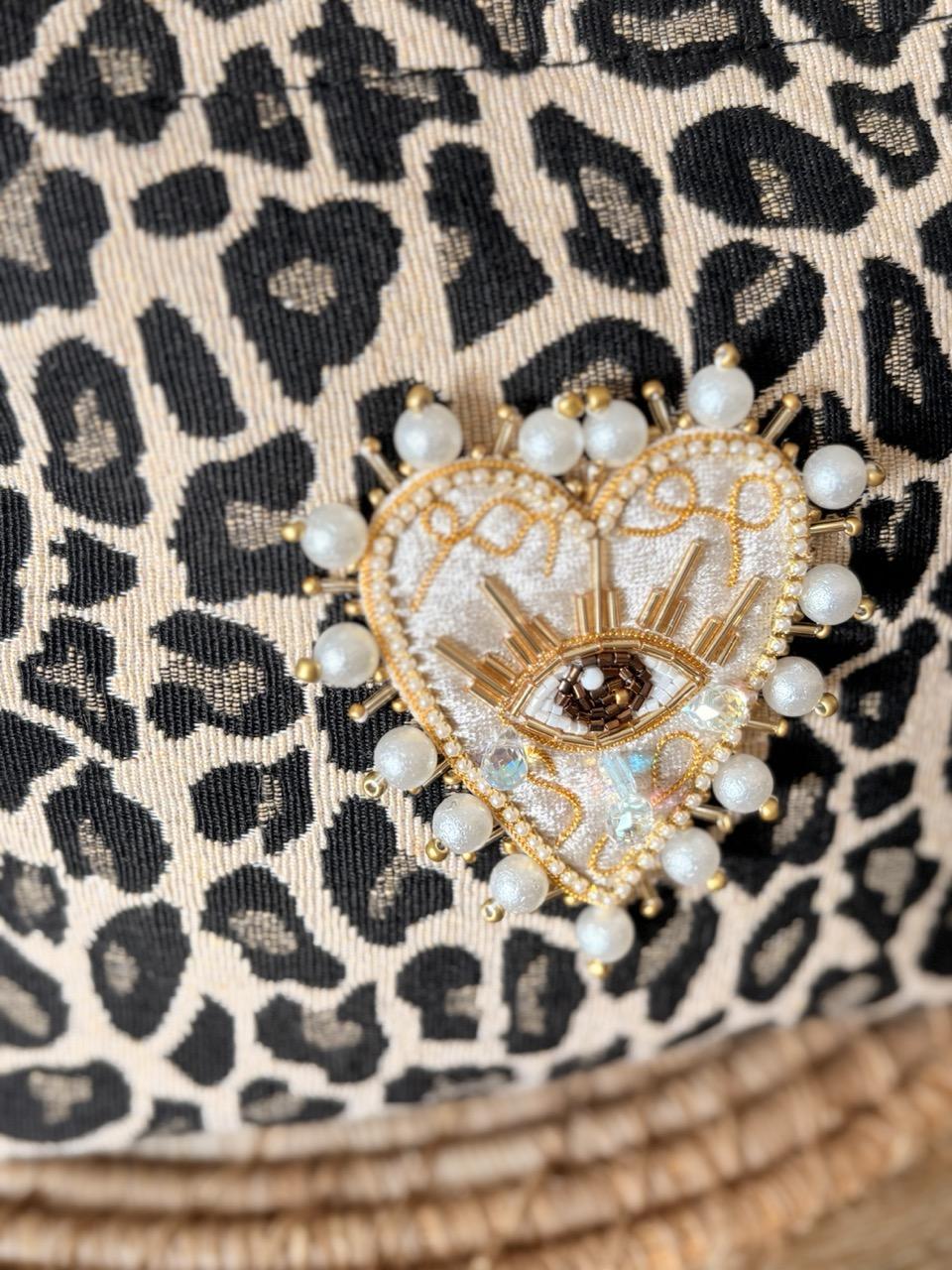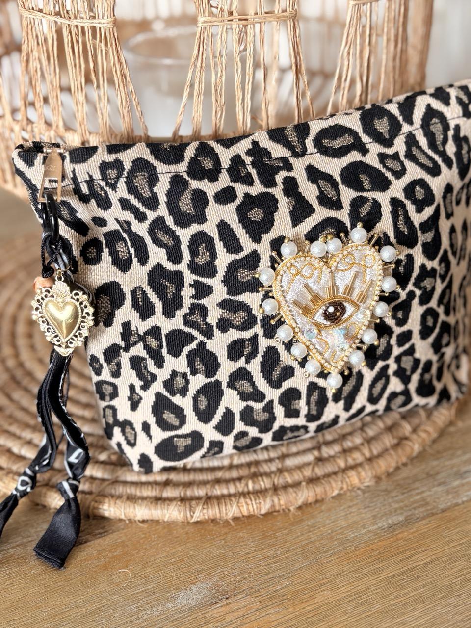 Pochette bohème en tissu imprimé léopard customisée avec un patch brodé sacré coeur en strass beige et un bijou de sac en bandana pouvant également servir de porte-clés.