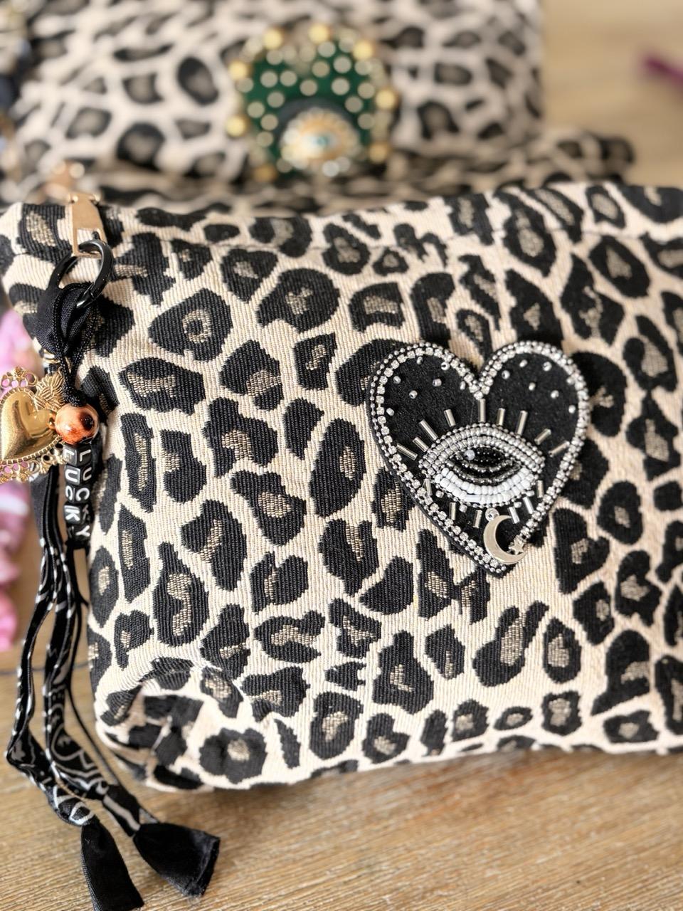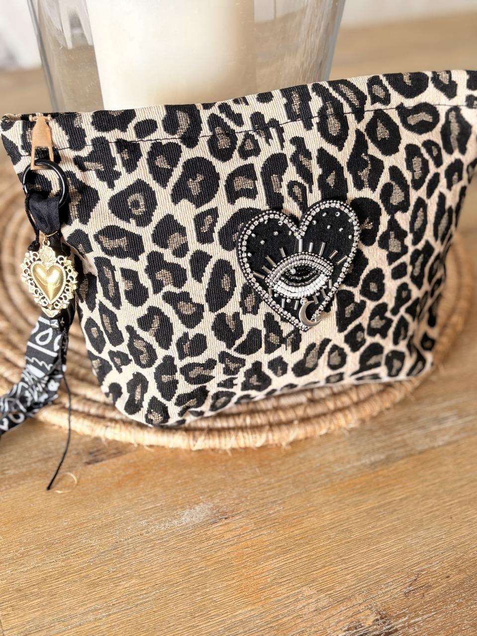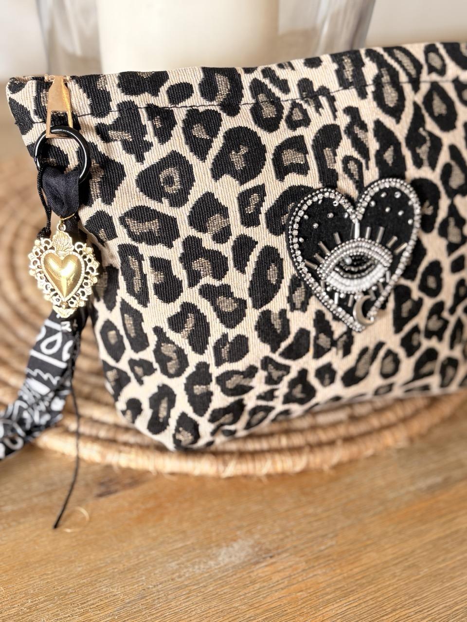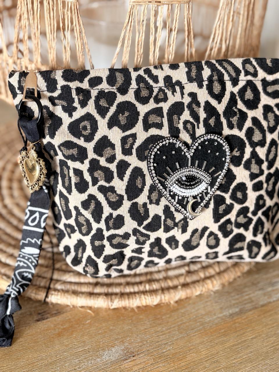 Pochette bohème en tissu imprimé léopard customisée avec un patch brodé sacré coeur en strass noir et un bijou de sac en bandana pouvant également servir de porte-clés.