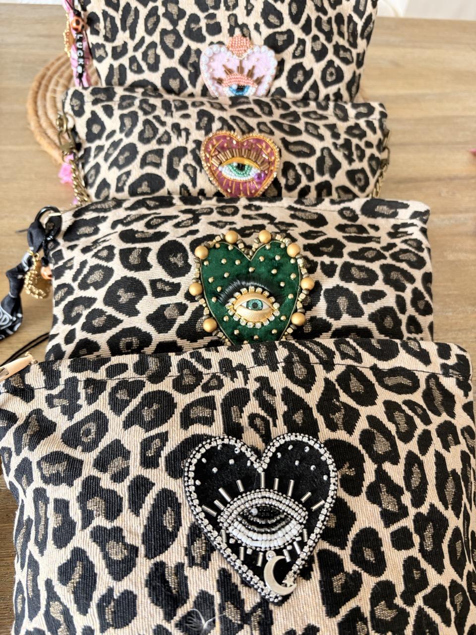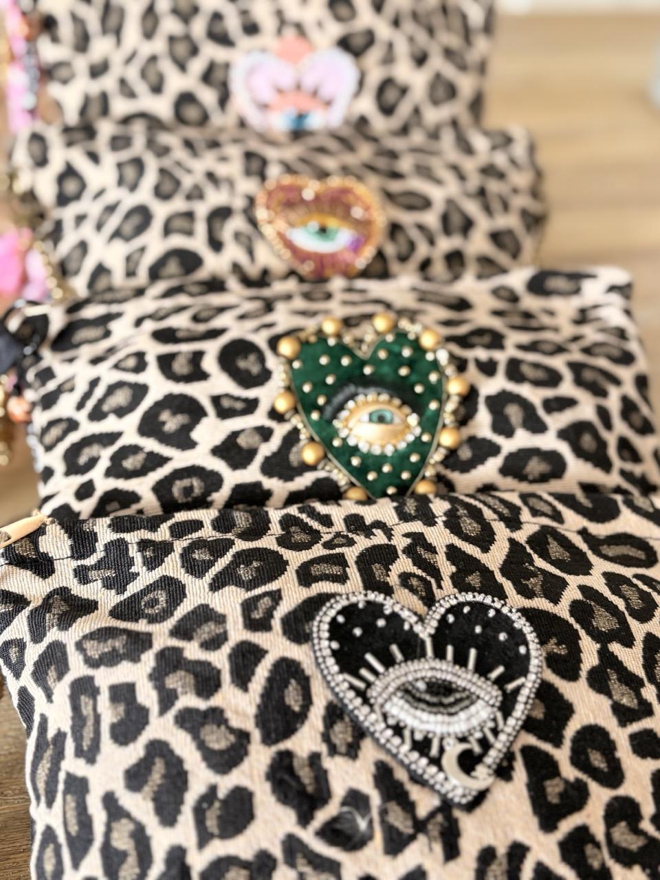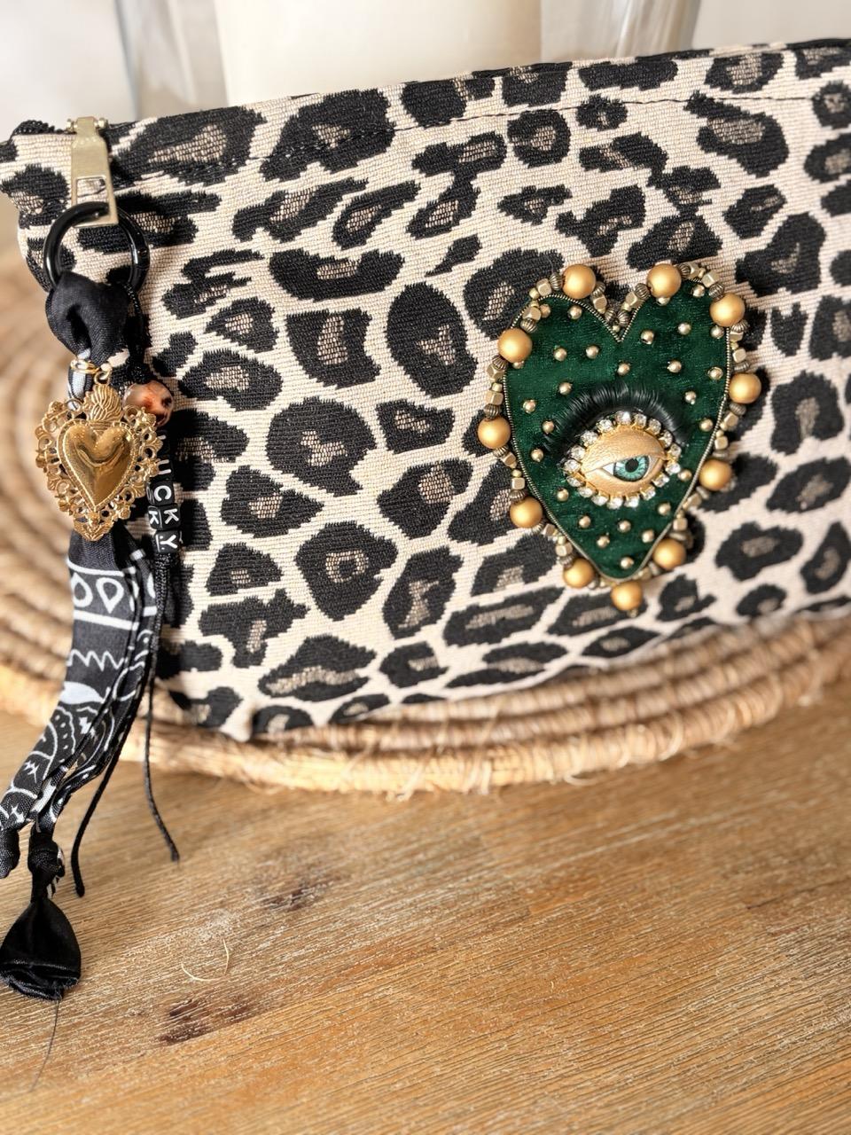 Pochette bohème en tissu imprimé léopard customisée avec un patch brodé sacré coeur en strass vert et un bijou de sac en bandana pouvant également servir de porte-clés.